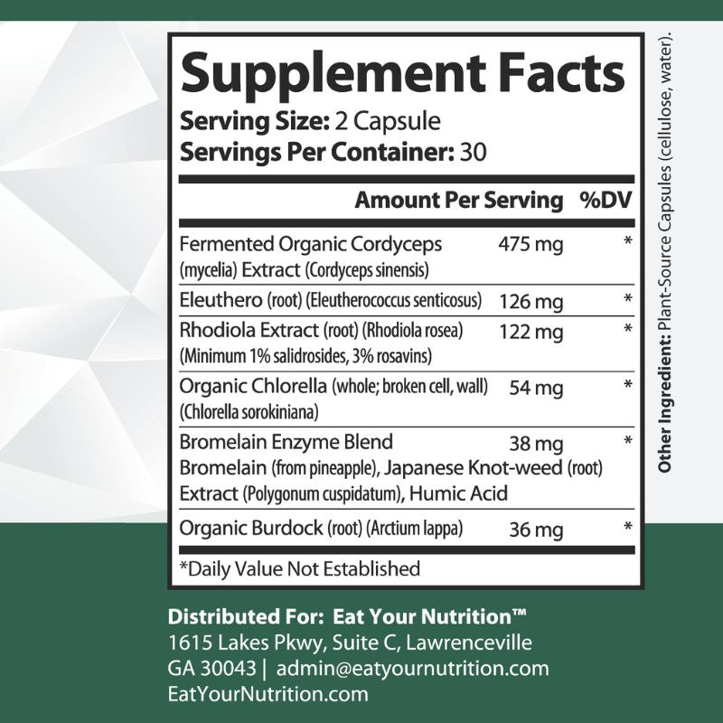 • Cordyceps and Eleuthero work together to support oxygen utilization, stamina, and sustained daily energy. All without caffeine or overstimulation.